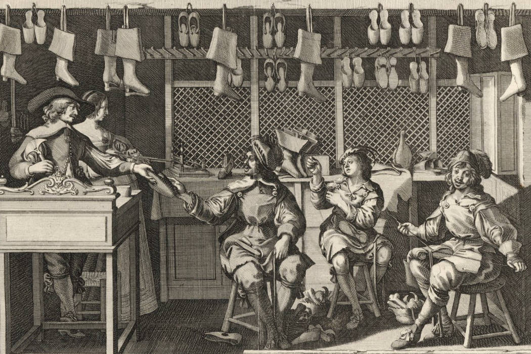 Dans la galerie du Palais, il montre un espace marchand, très en vogue en ce début de XVIIe siècle, dans l’Ile de la Cité, à proximité du Palais de Justice. On y voit trois boutiques : une lingerie, une mercerie et une librairie. La lingère se lamente et n’a aucun client. Le mercier montre des éventail Enfin, la libraire présente à un noble un livre nouveau.