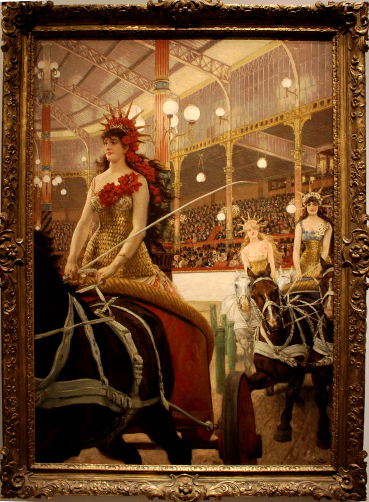 Avec cette toile, nous sommes toujours au cirque. Direction, l’hippodrome de l’Alma où se jouait à la fin du XIXe siècle des magnifiques spectacles équestres ! Cette toile pour Tissot est l’occasion de s’amuser entre la modernité des lieux, marqués par une architecture en métal et en verre, et le thème antique du spectacle, une course de char.