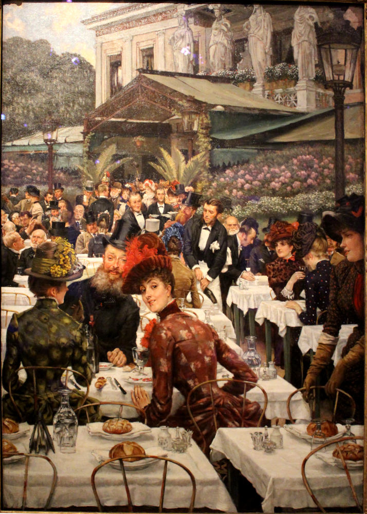 En cette décennie 1880, le Salon se tenait au Palais de l’Industrie. Son vernissage donnait lieu à de magnifiques festivités. Nous sommes, avec ce tableau, dans le jardin du Pavillon Ledoyen. Là, on avait dressé de nombreuses tables pour accueillir les artistes, leurs amis… Tissot appuie la présence de ces femmes d’artistes, en appuyant le regard de l’une d’entre elles en direction du spectateur.